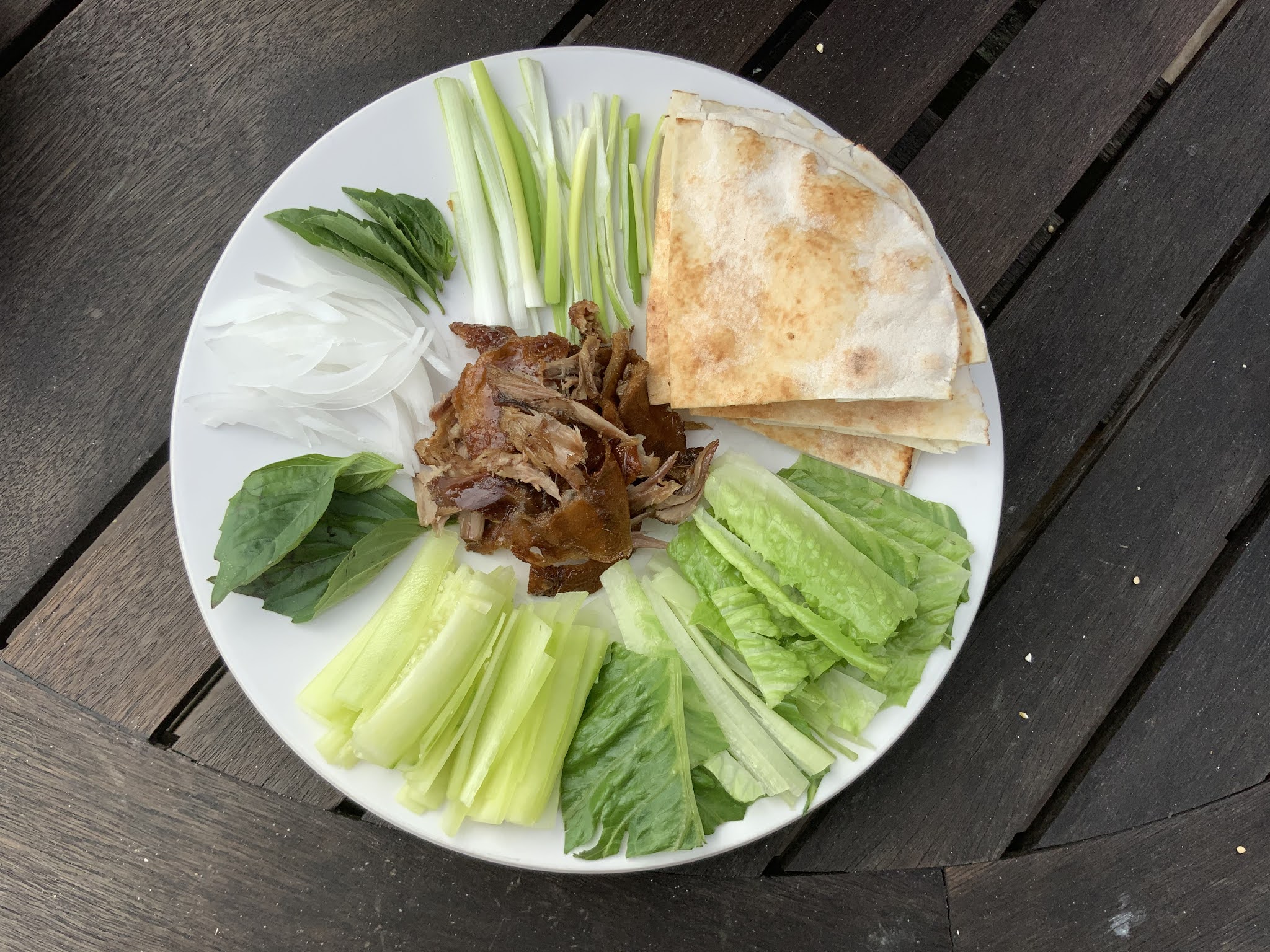 Nếu không, lại có thể cắt bốn, dấu chảo làm nóng thịt vịt lúc trước đã bớt đi phần dầu mỡ, đặt các phần bánh lên lấy chút giòn và ngậy, nhẹ nhàng kẹp rau và thịt vào giữa hai lớp vỏ thì được phần bánh kẹp.