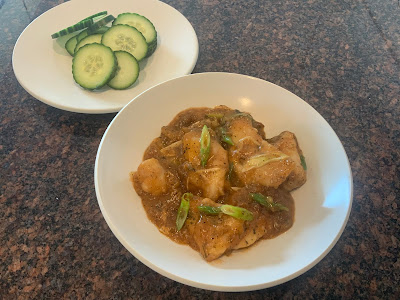 Bữa trưa hai người của chúng tôi vừa xinh một đĩa nhỏ cá mú đỏ chiên phủ sauce chua ngọt như vậy. Ăn kèm có non nửa trái dưa leo xắt lát.