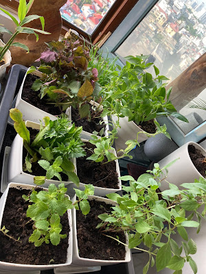 Tranh thủ mua cây rau gia vị cho mấy cô em để mang lên nhà núi, tôi lấy phần cho mình mỗi loại một bầu/túm cây. Về đến nhà, nhìn cái hiên bé tý thì mặt nghệt, tự trách mình đúng là tham. Rau cứ vậy mà được trồng tạm bợ trong đám chậu nhựa bé tý xíu. Ơn Giời, đến giờ chúng vẫn xoay xở sống tốt :-)