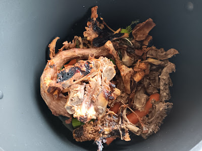 | xương gà nướng (và một cái xương cổ gà tây), cà rốt, tỏi, hành tây nướng sém, và bó gia vị vừa chuẩn bị |